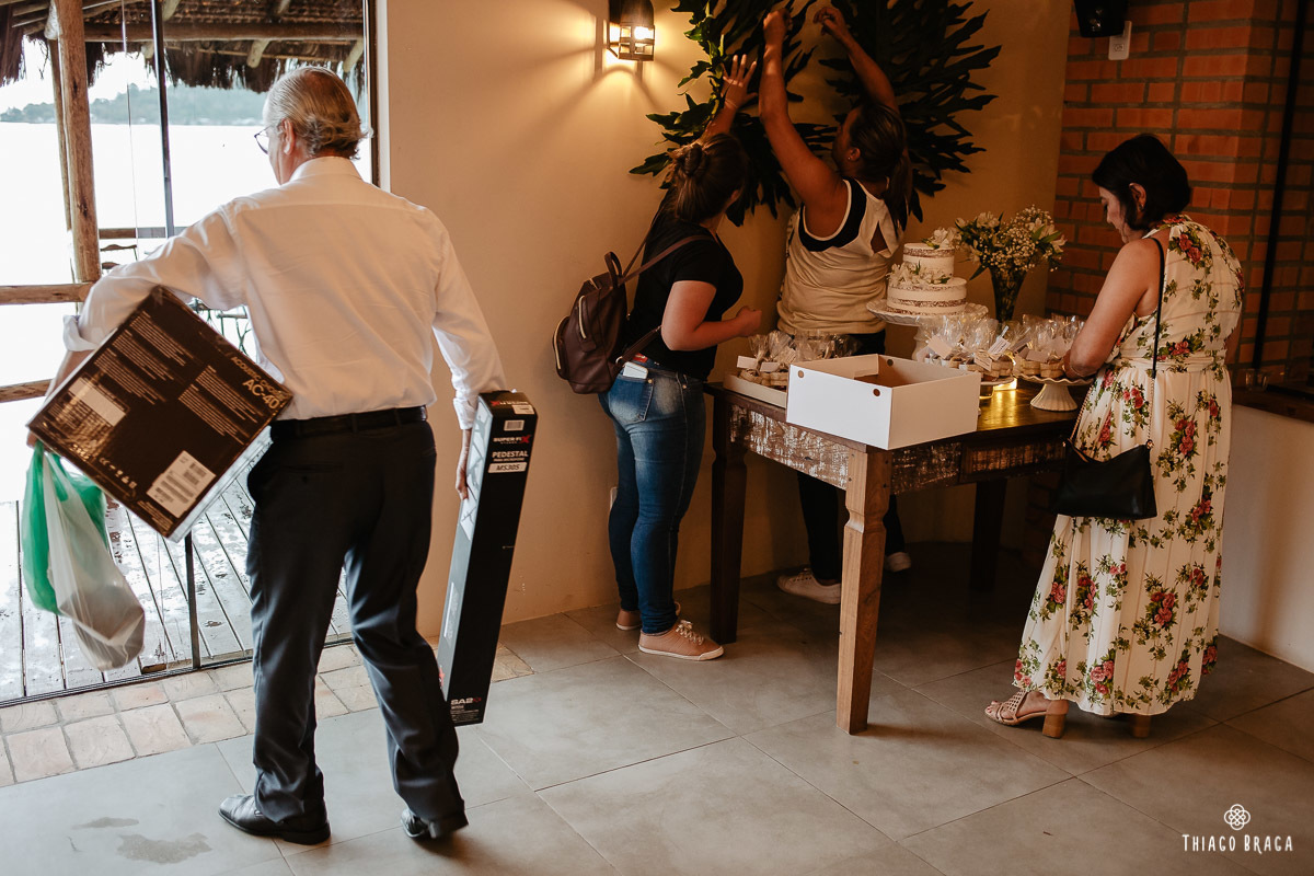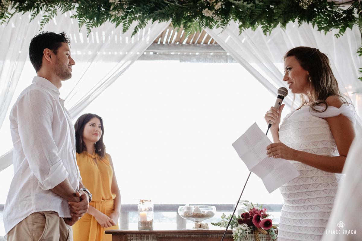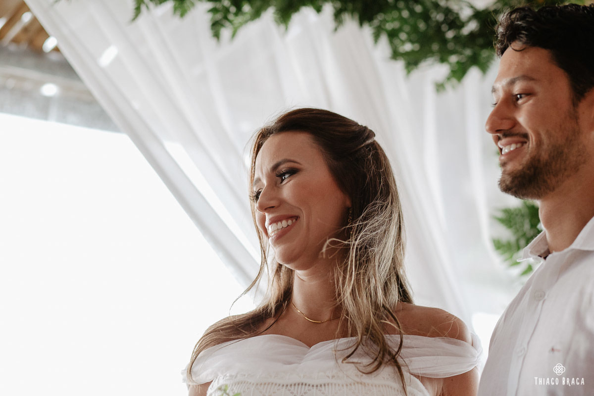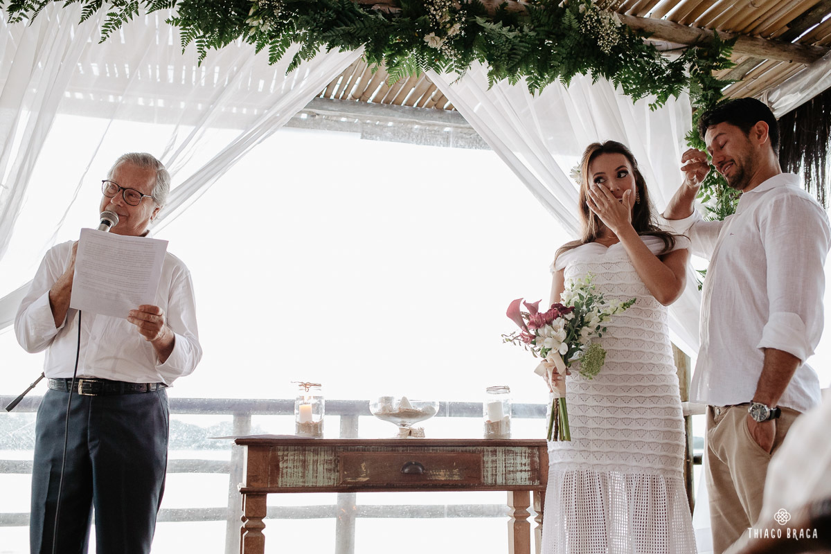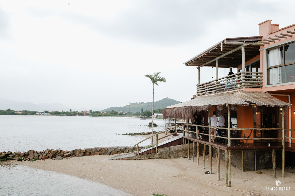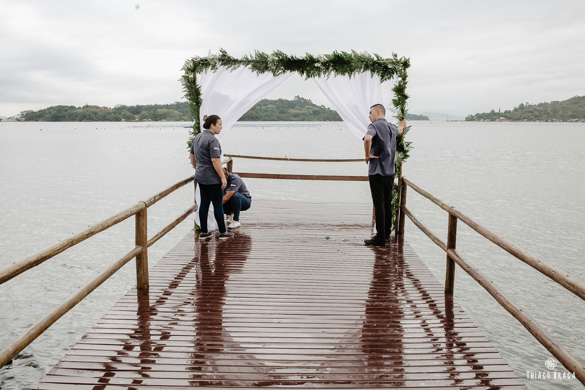 Tudo foi preparado para ser ao ar livre, no por do Sol mais lindo de Floripa mas a chuva deu um susto e mudou os planos do casal, quase na hora de início. Com muita calma, do jeito deles, tudo se transformou em minutos com a ajuda de todos e em pouco tempo o novo local da cerimônia foi preparado. E deu tudo muito certo, foi lindo demais, com emoções a flor da pele.