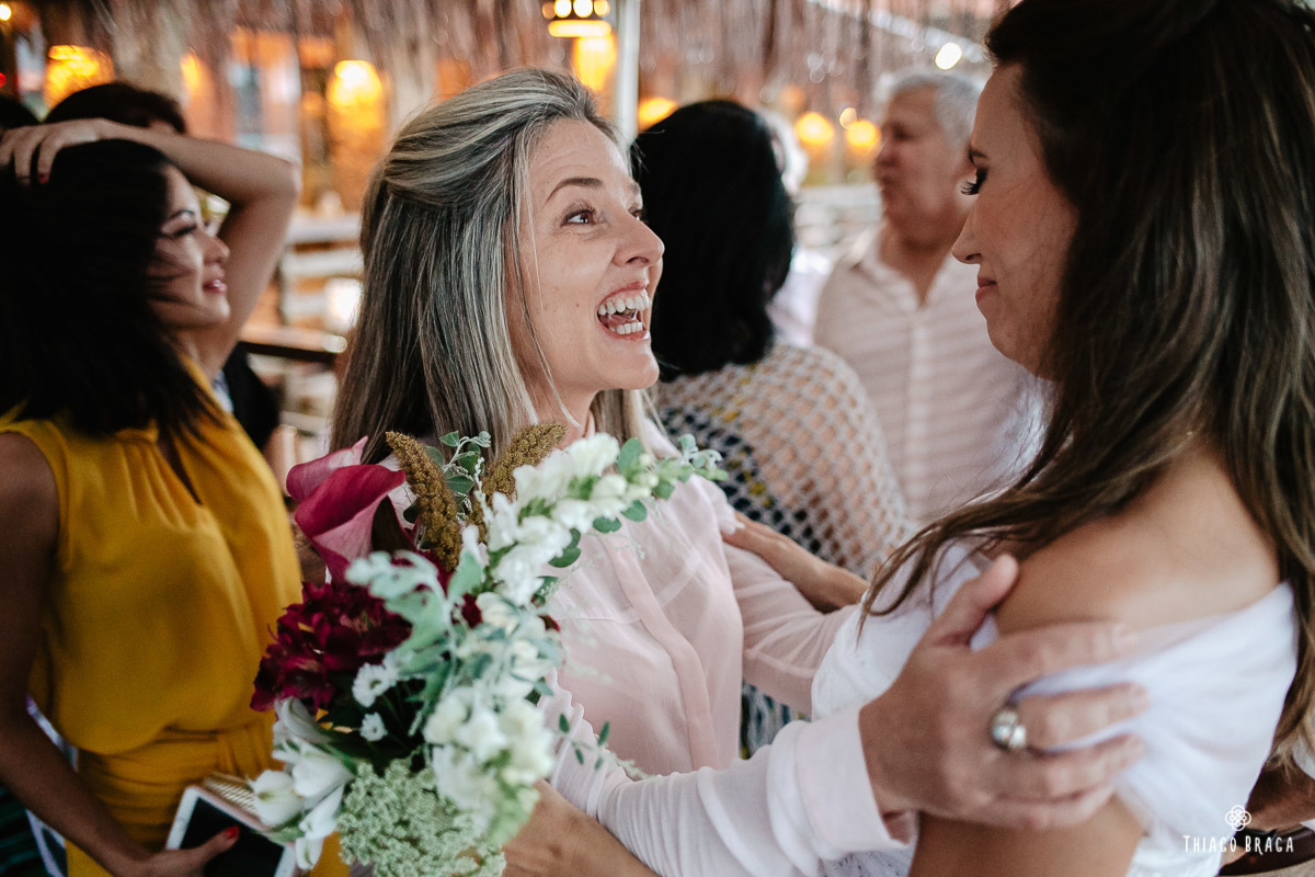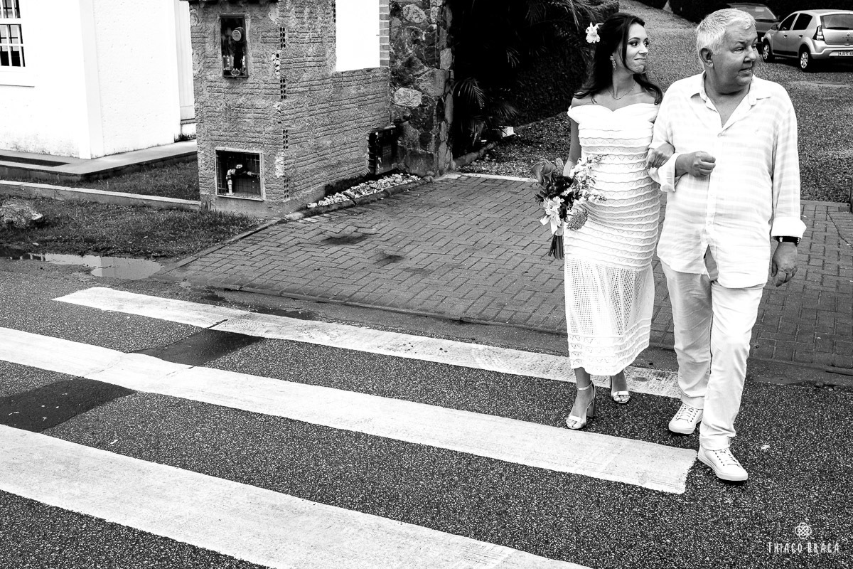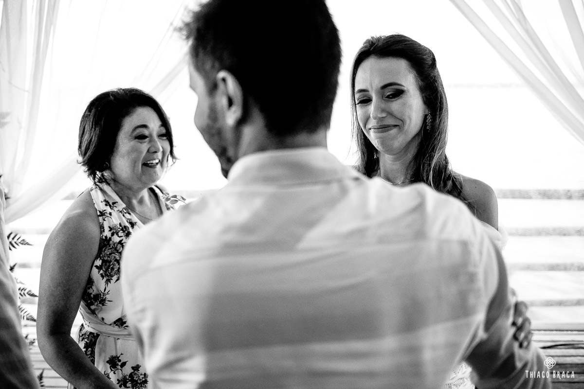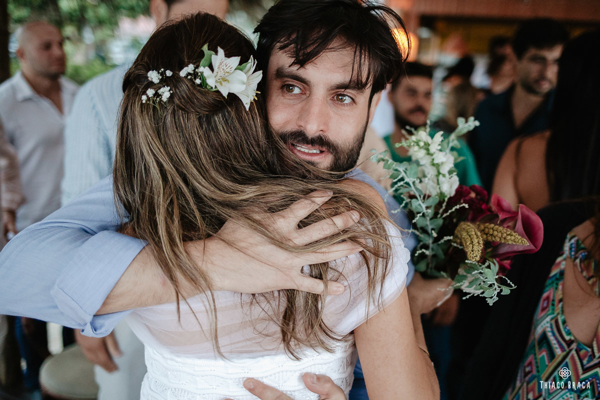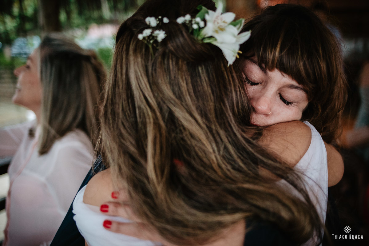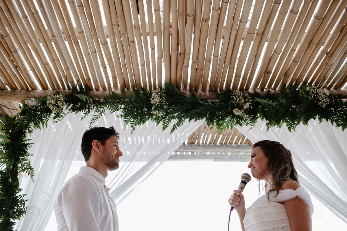 Tudo foi preparado para ser ao ar livre, no por do Sol mais lindo de Floripa mas a chuva deu um susto e mudou os planos do casal, quase na hora de início. Com muita calma, do jeito deles, tudo se transformou em minutos com a ajuda de todos e em pouco tempo o novo local da cerimônia foi preparado. E deu tudo muito certo, foi lindo demais, com emoções a flor da pele.