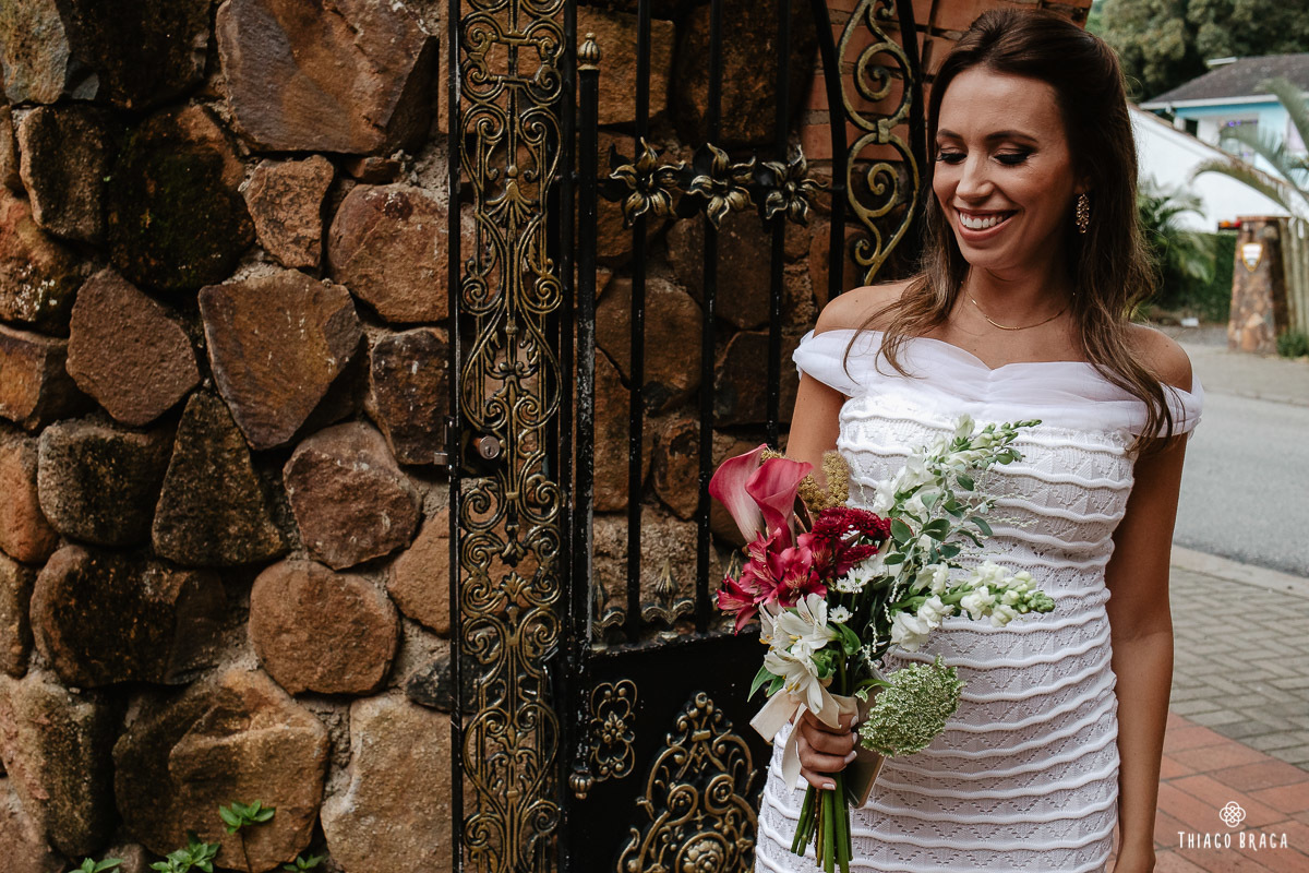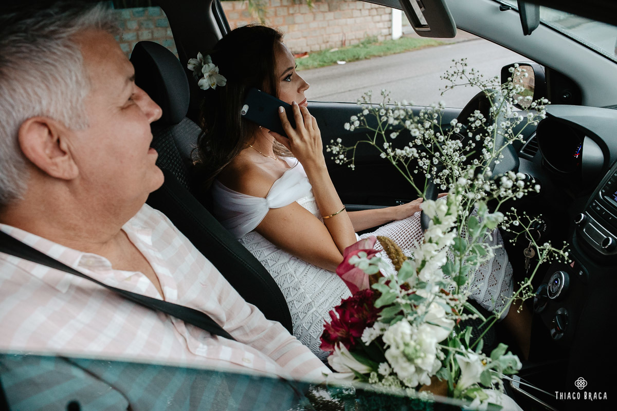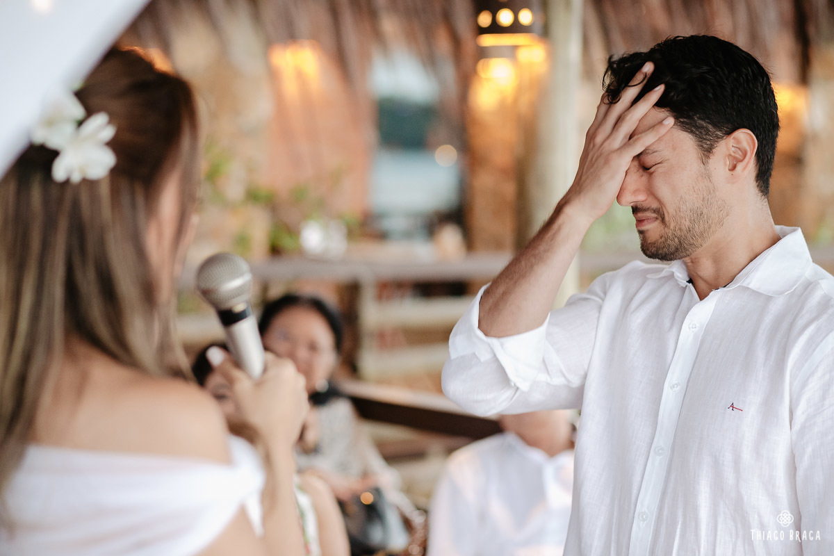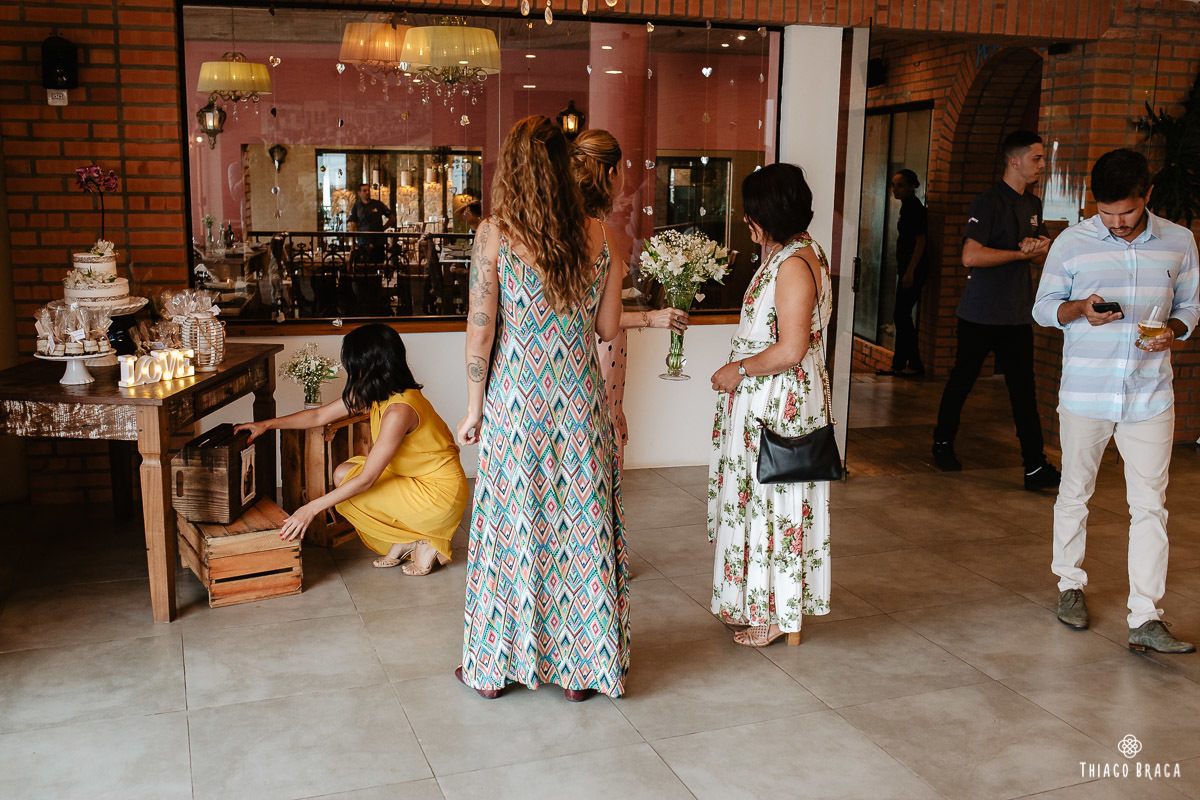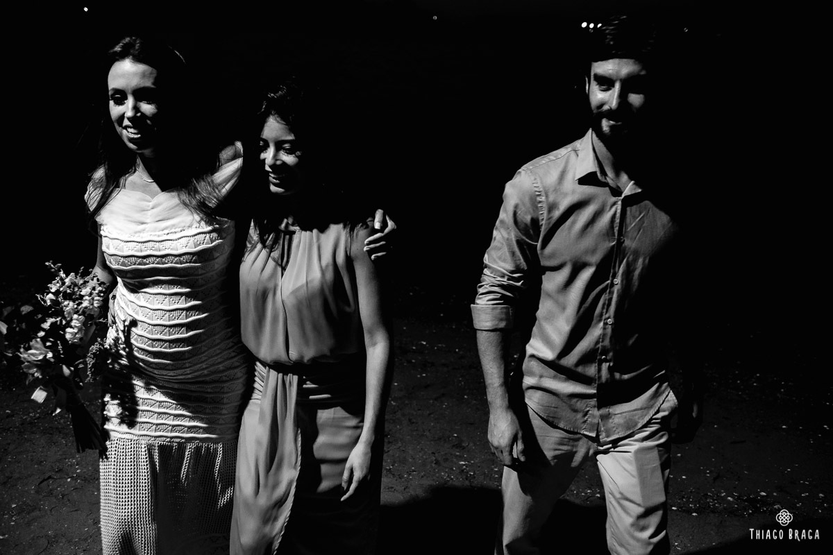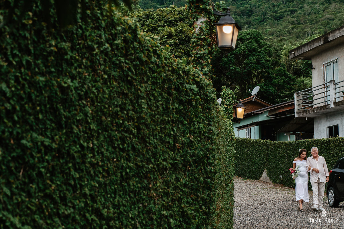 Tudo foi preparado para ser ao ar livre, no por do Sol mais lindo de Floripa mas a chuva deu um susto e mudou os planos do casal, quase na hora de início. Com muita calma, do jeito deles, tudo se transformou em minutos com a ajuda de todos e em pouco tempo o novo local da cerimônia foi preparado. E deu tudo muito certo, foi lindo demais, com emoções a flor da pele.