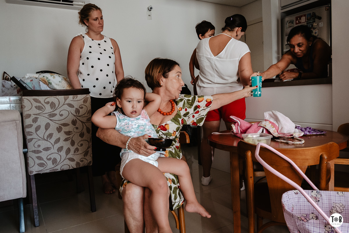 A preparação com todo carinho dos pais, a chegada dos avós, dos padrinhos, o banho, a roupinha nova, a correria pra chegar no horário haha! A festa é uma delícia e um misto de emoções, não é? Desde a vergonha de receber os convidados, a alegria de abrir os presentes, o choro de alguma frustração, a felicidade e surpresa do parabéns, a manha e o choro de cansaço. Tem até banho com sono, mais brincadeiras com os primos, e claro, história com a vovó e prece para agradecer um dia maravilhoso.